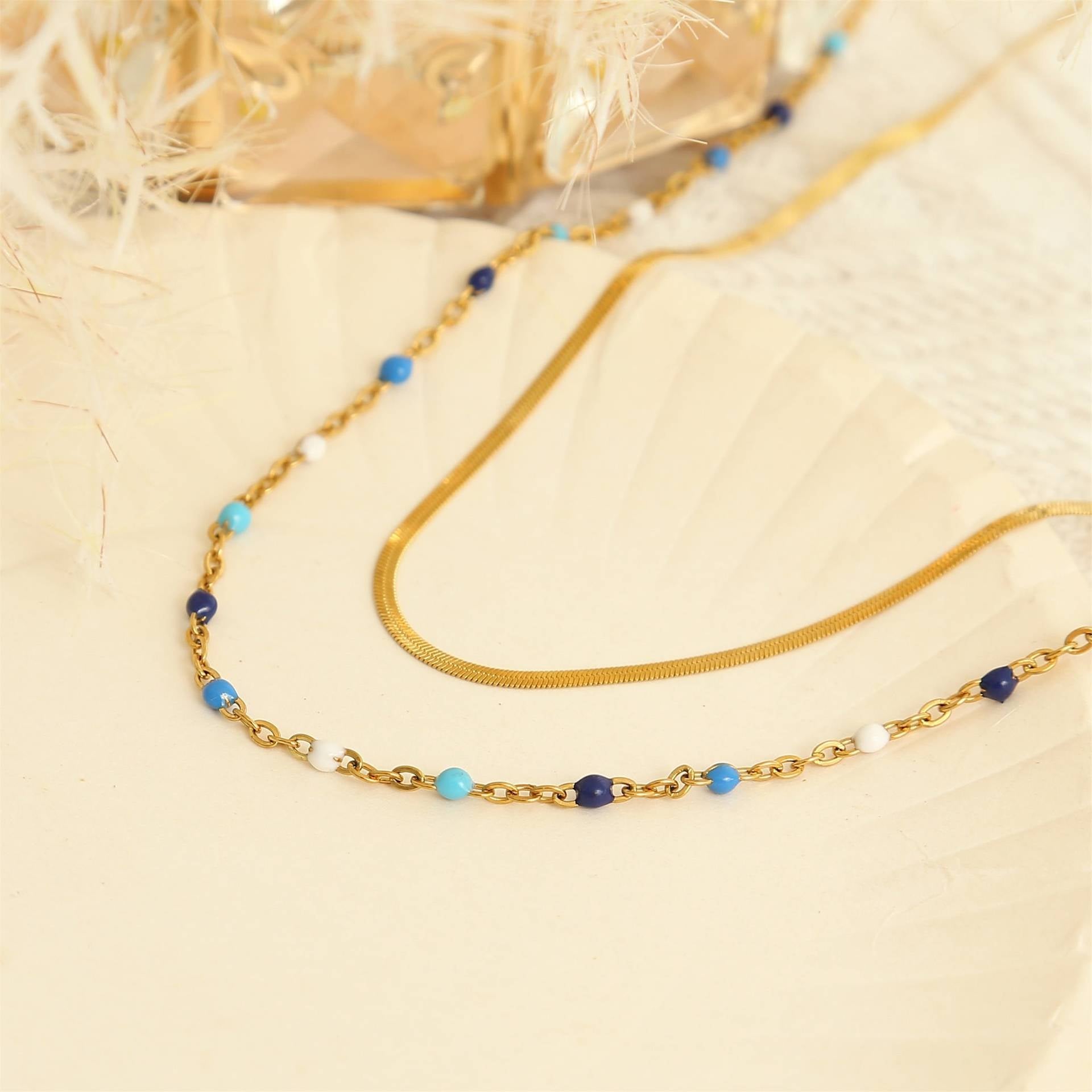 Bohemian Elegance & Subtle Luxury "Rimal" combines a smooth, golden snake chain with a delicate strand of colorful beads — a vibrant mix of deep blues, turquoise, ivory, and gold. These hues reflect the Mediterranean Sea, Saharan dunes, and artisan markets of Marrakech, coming together in a minimalist yet captivating design.